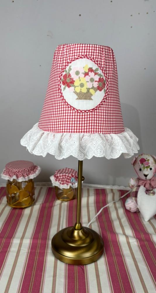 أبجورة جميلة بطابع ريفي أنيق، تتميز بنقشة مربعات حمراء كلاسيكية مع لمسة زهور لطيفة في المنتصف، إضافة إلى حافة مزينة بتفاصيل ناعمة تمنحها شكلًا جذابًا.